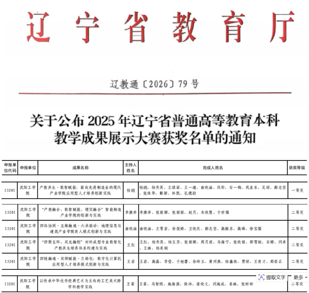 近日,辽宁省教育厅发布《关于公布2025年辽宁省普通高等教育本科教学成果展示大赛获奖名单的通知》(辽教通〔2026〕79号),我校表现突出,凭借扎实的教学改革实践与鲜明的育人特色,共斩获一等奖1项、二等奖5项,充分彰显了我校在本科教育教学改革领域的丰硕成果与育人实力。
